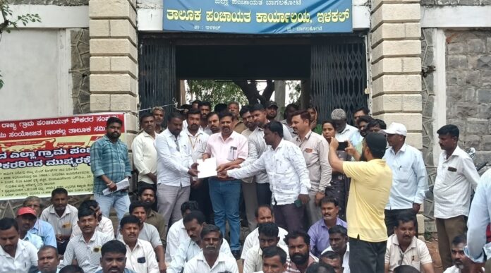ಕರ್ನಾಟಕ ರಾಜ್ಯ ಗ್ರಾಮ ಪಂಚಾಯತ್ ನೌಕರರ ಸಂಘ ರಾಜ್ಯದ ಎಲ್ಲಾ ಗ್ರಾಮ ಪಂಚಾಯತ್ ನೌಕರರಿಂದ ಮುಷ್ಕರಕ್ಕೆ ಕರೆ ನೀಡಿದ ಹಿನ್ನೆಲೆ ಬಾಗಲಕೋಟೆ ಜಿಲ್ಲೆಯ ನರೇಗಾ ನೌಕರರು ಇಳಕಲ್ ತಾಲೂಕು ಪಂಚಾಯಿತಿ ಕಚೇರಿ ಮುಂದೆ...
