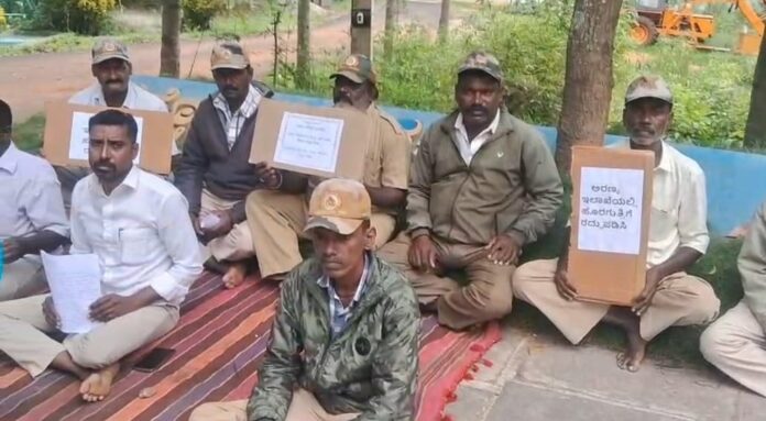 ತಮ್ಮ ಜೀವದ ಹಂಗು ತೊರೆದು, ದಿನಗೂಲಿ ನೌಕರರಾಗಿ ಅರಣ್ಯ ರಕ್ಷಣೆ ಮಾಡುತ್ತಿದ್ದ ನೌಕರರನ್ನು ಏಕಾಏಕಿ ಅರಣ್ಯ ಇಲಾಖೆ ಹೊರಗುತ್ತಿಗೆ ವಿಭಾಗಕ್ಕೆ ಸೇರಿಸಿರುವುದನ್ನು ವಿರೋಧಿಸಿ ದಿನಗೂಲಿ ನೌಕರರು ಅರಣ್ಯ ಇಲಾಖೆ ಮುಂದೆ ಮೌನ ಪ್ರತಿಭಟನೆ...