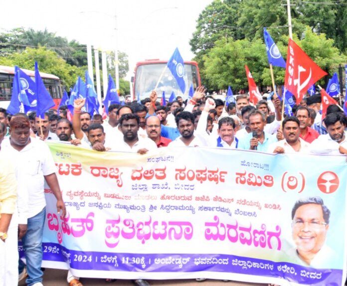 ರಾಜ್ಯಪಾಲ ಥಾವರ್ ಚಂದ್ ಗೆಹಲೋತ್ ಅವರು ಸಿಎಂ ಸಿದ್ಧರಾಮಯ್ಯ ವಿರುದ್ಧ ಪ್ರಾಸಿಕ್ಯೂಷನ್ಗೆ ಅನುಮತಿ ನೀಡಿದ ನಡೆ ಖಂಡಿಸಿ ರಾಜ್ಯಪಾಲರ ವಾಪಸಾತಿಗೆ ಆಗ್ರಹಿಸಿ ಕರ್ನಾಟಕ ರಾಜ್ಯ ದಲಿತ ಸಂಘರ್ಷ ಸಮಿತಿಯಿಂದ ಪ್ರತಿಭಟನೆ ನಡೆಯಿತು.