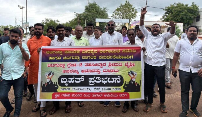 ಚಿಟಗುಪ್ಪ ತಾಲ್ಲೂಕಿನ ಗ್ರೇಡ್–2 ತಹಶೀಲ್ದಾರ್ ಜಯಶ್ರೀ ಅವರನ್ನು ಅಮಾನತು ಮಾಡಬೇಕೆಂದು ಆಗ್ರಹಿಸಿ ವೀರಶೈವ ಲಿಂಗಾಯತ ಸಮಾಜದಿಂದ ಚಿಟಗುಪ್ಪ ಪಟ್ಟಣದಲ್ಲಿ ಸೋಮವಾರ ಪ್ರತಿಭಟನಾ ಮೆರವಣಿಗೆ ನಡೆಯಿತು.
