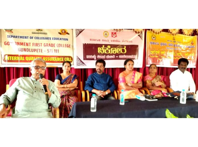 ಚಾಮರಾಜನಗರ ಜಿಲ್ಲೆ, ಗುಂಡ್ಲುಪೇಟೆ ಪಟ್ಟಣದ ಸರ್ಕಾರಿ ಪ್ರಥಮ ದರ್ಜೆ ಕಾಲೇಜಿನಲ್ಲಿ ಕರ್ನಾಟಕ ಸಾಹಿತ್ಯ ಅಕಾಡೆಮಿಯ ಚಕೋರ ವೇದಿಕೆ ಕಾರ್ಯಕ್ರಮದಲ್ಲಿ 'ಸ್ವಾತಂತ್ರ್ಯ ಚಳವಳಿ ಮತ್ತು ಕನ್ನಡ ಸಾಹಿತ್ಯ' ಎಂಬ ವಿಷಯ ಕುರಿತು ಮಾತನಾಡಿದ ಹಿರಿಯ...