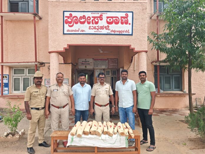 ಚಿಂತಾಮಣಿ:ತಾಲ್ಲೂಕಿನ ಬಟ್ಲಹಳ್ಳಿ ಪೊಲೀಸ್ ಠಾಣೆಯ ಪೊಲೀಸರು 8 ಜನ ಶ್ರೀಗಂಧದ ಕಳ್ಳತನದ ಆರೋಪಿಗಳನ್ನು ಬಂಧಿಸಿ,ಅವರಿಂದ 3.20 ಲಕ್ಷ ರೂ ಬೆಲೆ ಬಾಳುವ 32 ಕೆ.ಜಿಶ್ರೀಗಂಧದ ಮರದ ತುಂಡುಗಳನ್ನು ವಶಪಡಿಸಿಕೊಂಡಿದ್ದಾರೆ.