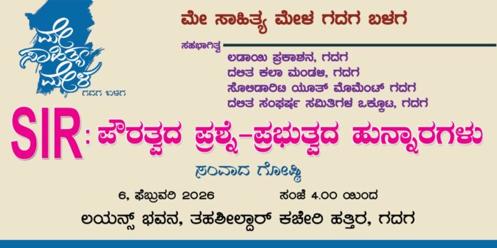 ಗದಗ ಮೇ ಸಾಹಿತ್ಯ ಮೇಳ ಬಳಗದ ವತಿಯಿಂದ ಲಡಾಯಿ ಪ್ರಕಾಶನ, ದಲಿತ ಕಲಾಮಂಡಳಿ, ಸೊಲಿಡಾರಿಟಿ ಯೂತ್ ಮೊಮೆಂಟ್, ದಲಿತ ಸಂಘರ್ಷ ಸಮಿತಿಗಳ ಒಕ್ಕೂಟಗಳ ಸಹಭಾಗಿತ್ವದಲ್ಲಿ ನಗರದ ತಹಶೀಲ್ದಾರ್ ಕಚೇರಿ ಹತ್ತಿರದ ಲಯನ್ಸ್ ಭವನದಲ್ಲಿ...
