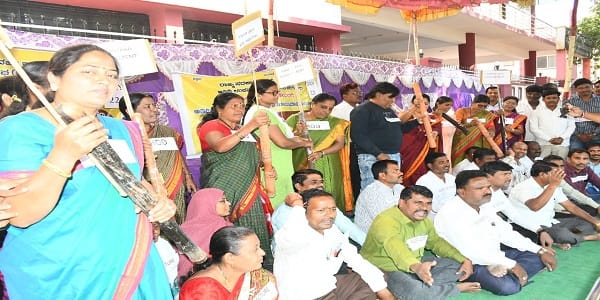 ಸರ್ಕಾರಿ ಪ್ರಥಮ ದರ್ಜೆ ಕಾಲೇಜಿನಲ್ಲಿ ಪ್ರಾಂಶುಪಾಲರು ಮತ್ತು ಎಚ್ಒಡಿಗಳಿಂದ ಅತಿಥಿ ಉಪನ್ಯಾಸಕರ ಮೇಲೆ ನಡೆಯುತ್ತಿರುವ ಶೋಷಣೆಯನ್ನು ವನಕೆ ಹಿಡಿದು ಅಣಕು ಪ್ರದರ್ಶನ ಮಾಡುವ ಮೂಲಕ ಪ್ರತಿಭಟನೆ ಮಾಡಿದ್ದಾರೆ.
