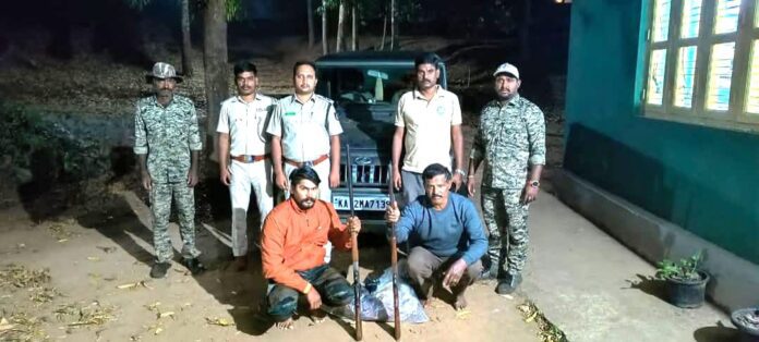 ಕೊಡಗು ಜಿಲ್ಲೆಯ ಕುಶಾಲನಗರದ ಸಮೀಪದ ಹೆಬ್ಬಾಲೆ ಜೇನುಕಲ್ ಬೆಟ್ಟ ಮೀಸಲು ಅರಣ್ಯದಲ್ಲಿ ಕಾಡು ಹಂದಿ ಬೇಟೆಯಾಡಿದ್ದ ಇಬ್ಬರನ್ನು ಅರಣ್ಯ ಇಲಾಖೆ ಸಿಬ್ಬಂದಿ ಬಂಧಿಸಿದ್ದಾರೆ.
