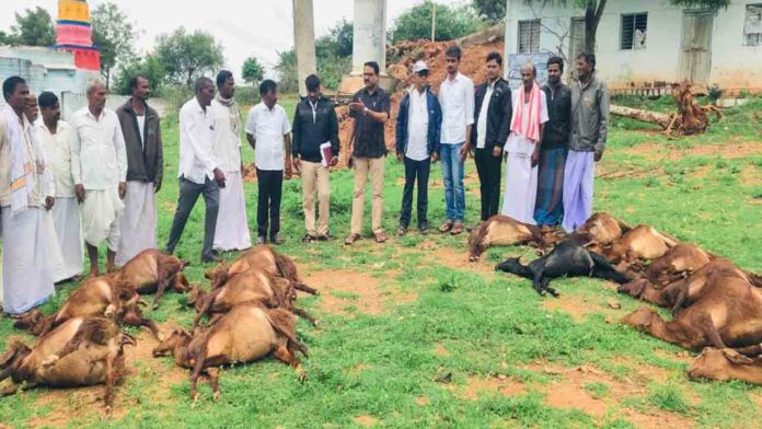 ವಿದ್ಯುತ್ ತಂತಿ ತಗುಲಿ ಎರಡು ಎತ್ತು ಹಾಗೂ 16 ಕುರಿಗಳು ಸಾವನ್ನಪ್ಪಿರುವ ಘಟನೆ ಕೊಪ್ಪಳ ಜಿಲ್ಲೆಯ ಕನಕಗಿರಿ ತಾಲೂಕಿನ ಕರಡಿಗುಡ್ಡ ಗ್ರಾಮದಲ್ಲಿ ನಡೆದಿದೆ. ಗ್ರಾಮಕ್ಕೆ ತಹಶೀಲ್ದಾರ್ ಧನಂಜಯ್ ಭೇಟಿ ನೀಡಿ, ಪರಿಶೀಲನೆ ನಡೆಸಿದ್ದಾರೆ....