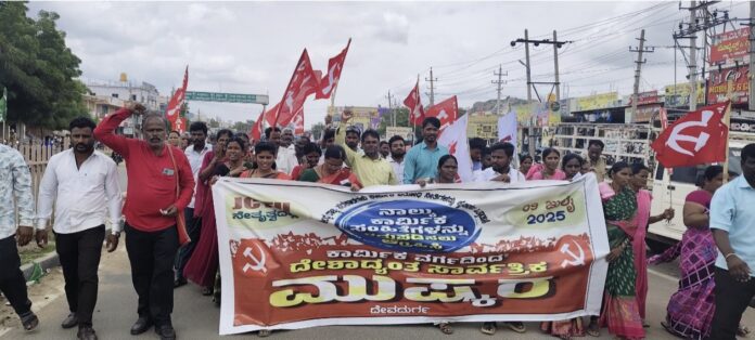 ಕೇಂದ್ರ ಸರ್ಕಾರ ಜಾರಿಮಾಡಲು ಮುಂದಾಗಿರುವ ನಾಲ್ಕು ಕಾರ್ಮಿಕ ಸಂಹಿತೆ ವಿರೋಧಿಸಿ ಕಾರ್ಮಿಕರ ಸಂಘಟನೆಗಳು ಕರೆ ನೀಡಿರುವ ಭಾರತ ಬಂದ್ಗೆ ಬೆಂಬಲಿಸಿ ದೇವದುರ್ಗ ಪಟ್ಟಣದಲ್ಲಿ ಪ್ರತಿಭಟನೆ ನಡೆಸಿದರು.ನಗರದ ಎಪಿಎಂಸಿಯಿಂದ ಮಿನಿವಿಧಾನಸೌಧದವರೆ ಮೆರವಣಿಗೆ ನಡೆಸಿ ಕೇಂದ್ರ...
