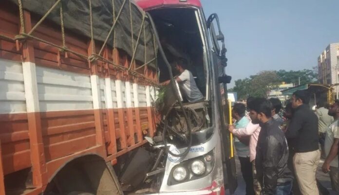 ಅಪಘಾತದ ತೀವ್ರತೆಗೆ ಬಸ್ ನಜ್ಜುಗುಜ್ಜಾಗಿದೆ. ಸ್ಥಳೀಯರು...