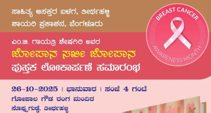 ಶಿವಮೊಗ್ಗ ಜಿಲ್ಲೆಯ ತೀರ್ಥಹಳ್ಳಿ ತಾಲೂಕಿನ ತಾಲೂಕಿನ ಪತ್ರಕರ್ತರೂ, ಕನ್ನಡ ಸಾಹಿತ್ಯ ಪರಿಷತ್ತಿನ ಕಾರ್ಯದರ್ಶಿಗಳೂ ಆಗಿರುವ ಗಾಯತ್ರಿ ಶೇಷಗಿರಿ ಅವರು 'ಸ್ತನ ಕ್ಯಾನ್ಸರ್'ನ ಕುರಿತಾಗಿ ಬರೆದಿರುವ“ಜೋಪಾನ ಸಖಿ ಜೋಪಾನ' ಪುಸ್ತಕದ ಬಿಡುಗಡೆ ಸಮಾರಂಭ ಅಕ್ಟೋಬರ್...