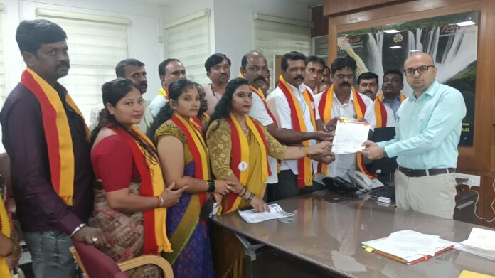 ಶಿವಮೊಗ್ಗ, ವಾಣಿಜ್ಯ ಮಳಿಗೆಯ ನಾಮಫಲಕ ಜಾಹೀರಾತು ಫಲಕ ಶಾಲೆ ಮತ್ತು ಶಾಲಾ ವಾಹನಗಳಲ್ಲಿನಾ ನಾಮಫಲಕ ಆಹಾರ ಸರಬರಾಜುಗಳಲ್ಲಿ ಕಡ್ಡಾಯವಾಗಿ ಕನ್ನಡ ಬಳಸುವಂತೆ ಒತ್ತಾಯಿಸಿ ಇಂದು ಕರವೇ ಸ್ವಾಭಿಮಾನಿ ಬಣ ಜಿಲ್ಲಾಧಿಕಾರಿಗಳಿಗೆ ಮನವಿ ನೀಡಿದ್ದಾರೆ.