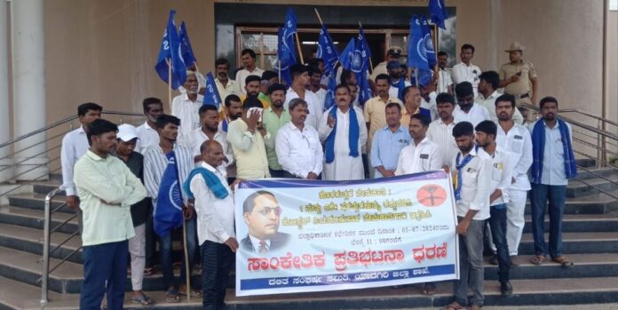 ಕರ್ನಾಟಕ ಸರ್ಕಾರವು ಹೊರಗುತ್ತಿಗೆ ನೇಮಕಾತಿಗಳಲ್ಲಿ ಮೀಸಲಾತಿ ಅಳವಡಿಸಿ ಹೊರಡಿಸಿರುವ ಸುತ್ತೋಲೆಯಲ್ಲಿ ನೇಮಕಾತಿಗೆ ಪಾಲಿಸಬೇಕಾದ ನಿಯಮಗಳನ್ನು ಮಾರ್ಪಡಿಸುವಂತೆ ಒತ್ತಾಯಿಸಿ ಯಾದಗಿರಿಯಲ್ಲಿ ದಲಿತ ಸಂಘರ್ಷ ಸಮಿತಿಯ ಮುಖಂಡರು ಜಿಲ್ಲಾಧಿಕಾರಿ ಕಚೇರಿ ಎದುರು ಪ್ರತಿಭಟನೆ ನಡೆಸಿದರು.