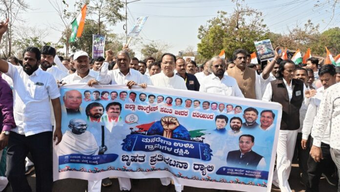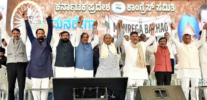ಯುಪಿಎ ಸರ್ಕಾರ ಜಾರಿಗೆ ತಂದಿದ್ದ ಮನರೇಗಾ ಕಾಯ್ದೆ ಮರು ಜಾರಿಯಾಗುವವರೆಗೆ ಹೋರಾಟ ಮುಂದುವಸುತ್ತೇವೆ. ʼಮನರೇಗಾ ಉಳಿಸಿ ಅಭಿಯಾನʼವನ್ನು ಜನಾಂದೋಲನವಾಗಿ ಪರಿವರ್ತಿಸುತ್ತೇವೆ ಎಂದು ರಾಜ್ಯ ಕಾಂಗ್ರೆಸ್ ನಾಯಕರು ಪ್ರತಿಜ್ಞೆ ಮಾಡಿದರು.
