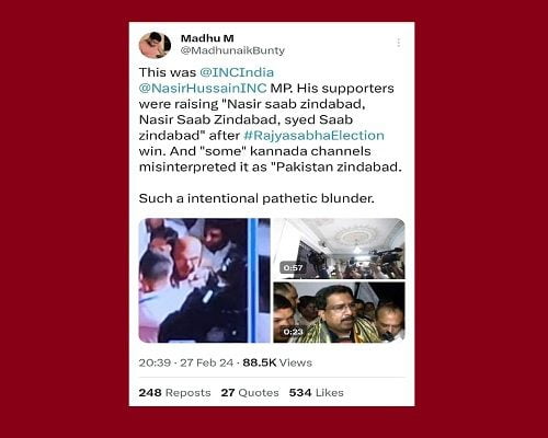 “ರಾಜ್ಯಸಭಾ ಚುನಾವಣೆಯಲ್ಲಿ ಕಾಂಗ್ರೆಸ್ನ ನಾಸೀರ್ ಹುಸೇನ್ ಅವರು ಗೆದ್ದ ಸಂದರ್ಭದಲ್ಲಿ ಕೂಗಿದ್ದು ಸಾಸೀರ್ ಸಾಬ್ ಜಿಂದಾಬಾದ್ ಎಂಬುದೇ ಹೊರತು, ಪಾಕಿಸ್ತಾನ್ ಜಿಂದಾಬಾದ್ ಅಲ್ಲ. ಆದರೆ ಕನ್ನಡದ ಮಾಧ್ಯಮಗಳು ಇದನ್ನು ತಿರುಚಿವೆ” ಎಂದು ಸ್ಥಳದಲ್ಲಿದ್ದ ಎಎನ್ಐ ಸುದ್ದಿಸಂಸ್ಥೆಯ ಪತ್ರಕರ್ತ ಎಂ.ಮಧು ತಿಳಿಸಿದ್ದಾರೆ.