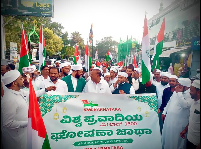 ಮೈಸೂರು ನಗರದ ಅಶೋಕ ರಸ್ತೆಯಲ್ಲಿರುವ ಮೀಲಾದ್ ಪಾರ್ಕ್ ವೃತ್ತದಲ್ಲಿ ‘ಸುನ್ನಿ ಯುವಜನ ಸಂಘ‘ದ ವತಿಯಿಂದ ಸೋಮವಾರ ಅಯೋಜಿಸಿದ್ದ ‘ಪ್ರವಾದಿ ಮುಹಮ್ಮದ್ ಪೈಗಂಬರ್‘ ಅವರ ಜನ್ಮ ದಿನಾಚರಣೆಯ ಅಂಗವಾಗಿ ಹಜರತ್ ಮೌಲಾನಾ ಮೊಹಮ್ಮದ್ ಉಸ್ಮಾನ್ ಷರೀಫ್ ಸಾಹೇಬ್, ಸರ್ ಖಾಜಿ ನೇತೃತ್ವದಲ್ಲಿ ಜಮಾಅತರ ಸಹಯೋಗದೊಂದಿಗೆ ಮೀಲಾದ ಘೋಷಣಾ ಜಾಥಾ ನಡೆಯಿತು.
