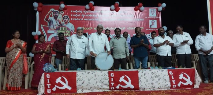 ನಗರದ ಟಿ.ಚೆನ್ನಯ್ಯ ರಂಗಮಂದಿರದಲ್ಲಿ ಶನಿವಾರ ಸೆಂಟರ್ ಆಫ್ ಇಂಡಿಯನ್ ಟ್ರೇಡ್ ಯೂನಿಯನ್ (ಸಿಐಟಿಯು) ಸಂಘಟನೆಯ ಏಳನೇ ಜಿಲ್ಲಾ ಸಮ್ಮೇಳನದ ಬಹಿರಂಗ ಸಭೆಯನ್ನು ತಮಟೆ ಬಾರಿಸುವ ಮೂಲಕ ಉದ್ಘಾಟಿಸಿ ಮಾತನಾಡಿದ ಅವರು ಸರ್ಕಾರಗಳು ಮಾಲೀಕನಿಗೆ ಅನುಕೂಲವಾಗುವಂತೆ ಕಾನೂನು ರೂಪಿಸಿ ಕಾರ್ಮಿಕರನ್ನು ಬೀದಿಗೆ ತಳ್ಳಿದ್ದಾರೆ ರಾಜಕೀಯ ವ್ಯವಸ್ಥೆ ಯಾವತ್ತೂ ಕಾರ್ಮಿಕರ ಪರ ನಿಲ್ಲುವುದಿಲ್ಲ ಶೋಷಣೆ ಇಲ್ಲದ ಸಮಾಜ ನಿರ್ಮಾಣಕ್ಕೆ ನಾವು ಎಲ್ಲರೂ ಒಂದಾಗುವ ಮೂಲಕ ಸರ್ಕಾರಗಳಿಗೆ ಎಚ್ಚರಿಕೆ ಕೊಡಬೇಕಾಗಿದೆ ಎಂದರು.