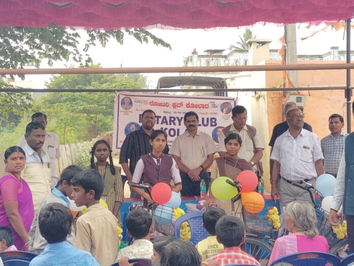 ಕೋಲಾರ : ತಾಲೂಕಿನ ಯಲವಾರ ಗ್ರಾಮದಲ್ಲಿ ರೋಟರಿ ಕ್ಲಬ್ ಕೋಲಾರ ಹಾಗೂ ರೋಟರಿ ಲೇಕ್ ಸೈಡ್ ಬೆಂಗಳೂರು ಸಂಸ್ಥೆಯ ಸಹಯೋಗದಲ್ಲಿ 8ನೇ ತರಗತಿಯ ವಿದ್ಯಾರ್ಥಿ ನಿಯರಿಗೆ 5 ಉಚಿತ ಬೈಸಿಕಲ್ ಗಳನ್ನು ವಿತರಿಸಿ ಮಾತನಾಡಿ, ಸಂಘ ಸಂಸ್ಥೆಗಳು ಹಾಗೂ ಸರಕಾರಗಳು ವಿವಿಧ ಯೋಜನೆಗಳನ್ನು ನೀಡಿದ್ದು, ಪೋಷಕರು ಮಕ್ಕಳ ಉಜ್ವಲ ಭವಿಷ್ಯಕ್ಕಾಗಿ ಕಡ್ಡಾಯ ಶಿಕ್ಷಣಕ್ಕೆ ಹೆಚ್ಚು ಒತ್ತು ನೀಡಬೇಕು ಎಂದರು.