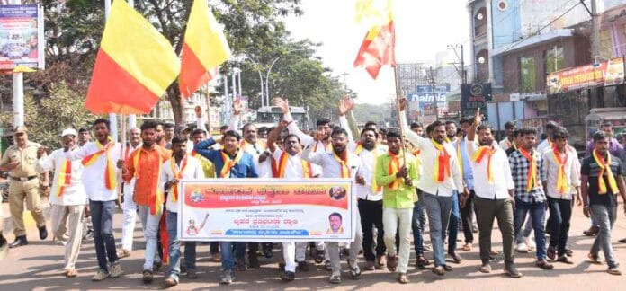 ಕರ್ನಾಟಕ ರಕ್ಷಣಾ ವೇದಿಕೆ ರಾಜ್ಯಾಧ್ಯಕ್ಷ ಟಿ.ಎ.ನಾರಾಯಣಗೌಡ ಮತ್ತು ಕಾರ್ಯಕರ್ತರನ್ನು ಕೂಡಲೇ ಬಿಡುಗಡೆಗೆ ಮಾಡಬೇಕೆಂದು ಆಗ್ರಹಿಸಿ ಕರವೇ ಕಾರ್ಯಕರ್ತರು ಬೃಹತ್ ಪ್ರತಿಭಟನಾ ಮೆರವಣಿಗೆ ನಡೆಸಿದರು.