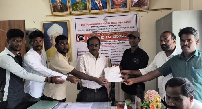 ಚಿಕ್ಕಬಳ್ಳಾಪುರ ಜಿಲ್ಲೆಯ ಬಾಗೇಪಲ್ಲಿ ಪಟ್ಟಣದ ಸರಕಾರಿ ಪದವಿ ಪೂರ್ವ ಕಾಲೇಜು ಆಟದ ಮೈದಾನದಲ್ಲಿ ನಿರ್ಮಾಣ ಮಾಡಲು ಉದ್ದೇಶಿಸಿರುವ ಗುರುಭವನ ನಿರ್ಮಾಣ ಯೋಜನೆಯನ್ನು ಕೈಬಿಟ್ಟು ಬೇರೆ ಸ್ಥಳದಲ್ಲಿ ನಿರ್ಮಾಣ ಮಾಡಬೇಕೆಂದು ಆಗ್ರಹಿಸಿ ತಾಲೂಕು ಎಸ್ಎಫ್ಐ ಮತ್ತು ಡಿವೈಎಫ್ವತಿಯಿಂದ ಕ್ಷೇತ್ರ ಶಿಕ್ಷಣಾಧಿಕಾರಿಗಳಿಗೆ ಕಾರ್ಯಕರ್ತರು ಮನವಿ ಸಲ್ಲಿಸಿದರು.