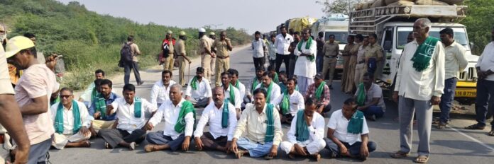 ಕರ್ನಾಟಕ ರಾಜ್ಯದಿಂದ ತೆಲಂಗಾಣ ರಾಜ್ಯಕ್ಕೆ ಭತ್ತ ಸಾಗಾಟ ನಿರ್ಬಂಧಿಸಿರುವುದನ್ನು ಖಂಡಿಸಿ ಕರ್ನಾಟಕ ರಾಜ್ಯ ರೈತ ಸಂಘದ ರಾಯಚೂರು ಜಿಲ್ಲಾ ಘಟಕದ ಪದಾಧಿಕಾರಿಗಳು ಗುರುವಾರ ಕೃಷ್ಣ ಮೇಲ್ಸೇತುವೆ(ಬ್ರಿಜ್) ಬಳಿ ರಸ್ತೆ ತಡೆ ಪ್ರತಿಭಟನೆ ನಡೆಸಿದರು.