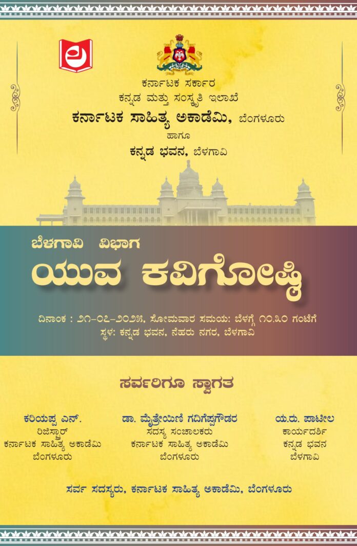 ಕರ್ನಾಟಕ ಸಾಹಿತ್ಯ ಅಕಾಡೆಮಿಯ ಪ್ರತಿಷ್ಠಿತ ಯುವ ಕವಿಗೋಷ್ಠಿಗೆ ಒಟ್ಟು 23 ಯುವಕವಿಗಳು ಆಯ್ಕೆಯಾಗಿದ್ದು ಜುಲೈ 21ರಂದು ಅಂದರೆ ಇಂದು ಬೆಳಗಾವಿ ಪಟ್ಟಣದ ಮುನ್ನಡ ಭವನದಲ್ಲಿ ನಡೆಯಲಿದೆ.