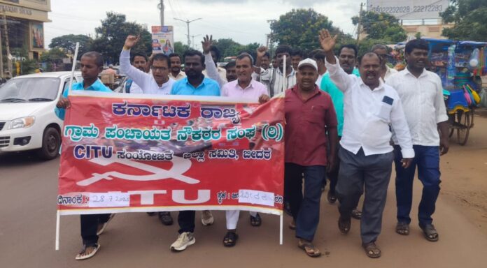 ಕಾರ್ಮಿಕರಿಗೆ ಕನಿಷ್ಠ ₹36 ಸಾವಿರ ವೇತನ ನಿಗದಿ ಸೇರಿದಂತೆ ವಿವಿಧ ಬೇಡಿಕೆಗಳ ಈಡೇರಿಕೆಗೆ ಆಗ್ರಹಿಸಿ ಸಿಐಟಿಯು ಜಿಲ್ಲಾ ಸಮಿತಿ ಹಾಗೂ ಕರ್ನಾಟಕ ರಾಜ್ಯ ಗ್ರಾಮ ಪಂಚಾಯಿತಿ ನೌಕರರ ಸಂಘದಿಂದ ನಗರದಲ್ಲಿ ಸೋಮವಾರ ಪ್ರತಿಭಟನೆ ನಡೆಸಲಾಯಿತು.