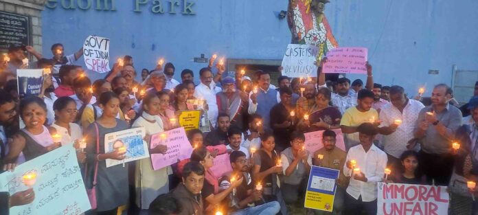 ಜಾತಿ ದೌರ್ಜನ್ಯಗಳು ಕೊನೆಗೊಳ್ಳಬೇಕು, ಮರ್ಯಾದೆಗೇಡು ಹತ್ಯೆ ನಿಲ್ಲಬೇಕು ಹಾಗೂ ಉತ್ತರ ಪ್ರದೇಶದಲ್ಲಿ ದಲಿತ ನಾಯಕ ಚಂದ್ರಶೇಖರ್ ಆಝಾದ್ ಮೇಲಿನ ದಾಳಿಯನ್ನು ಖಂಡಿಸಿ ಬೆಂಗಳೂರಿನಲ್ಲಿ ನಾಗರಿಕರ ಒಕ್ಕೂಟವು ‘ಕ್ಯಾಂಡಲ್‌ ಲೈಟ್’ ಪ್ರತಿಭಟನೆ ನಡೆಸಿತು.