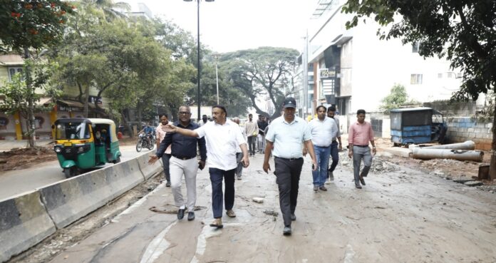 ಸರ್ವಿಸ್ ರಸ್ತೆ ದುರಸ್ತಿ: ಭದ್ರಪ್ಪ ಲೇಔಟ್ ಮೇಲ್ಸೇತುವೆ ಬಳಿಯ ಸರ್ವಿಸ್ ರಸ್ತೆ ಹಾಳಾಗಿದ್ದು, ಹೈ ಡೆನ್ಸಿಟಿ ಕಾರಿಡಾರ್ ಯೋಜನೆಯಡಿ ಅಭಿವೃದ್ಧಿ ಕಾಮಗಾರಿ ಪ್ರಗತಿಯಲ್ಲಿದೆ. ಇದೇ ಸ್ಥಳದಲ್ಲಿ ಕೆ-ರೈಡ್ ವತಿಯಿಂದ ಕಾಮಗಾರಿ ನಡೆಯುತ್ತಿರುವುದರಿಂದ, ಆ ಇಲಾಖೆಯೊಂದಿಗೆ ಸಮನ್ವಯ ಸಾಧಿಸಿ ಸರ್ವಿಸ್ ರಸ್ತೆಯ ದುರಸ್ಥಿಯನ್ನು ಶೀಘ್ರ ಪೂರ್ಣಗೊಳಿಸಲು ಸೂಚಿಸಿದರು. ಭದ್ರಪ್ಪ ಲೇಔಟ್ ಮೇಲ್ಸೇತುವೆ ಬಳಿಕದ ಹೊರ ವರ್ತುಲ ರಸ್ತೆಗೆ ಡಾಂಬರೀಕರಣ ಮಾಡಲಾಗಿದ್ದು, ರಸ್ತೆ ಬದಿಯ ಡಕ್ಟ್ಗಳ ಚೇಂಬರ್ಗಳು ರಸ್ತೆ ಮಟ್ಟಕ್ಕಿಂತ ಕೆಳಗಿರುವುದನ್ನು ಗಮನಿಸಿ, ಅವುಗಳನ್ನು ತಕ್ಷಣ ರಸ್ತೆ ಮಟ್ಟಕ್ಕೆ ತರಲು ಸೂಚಿಸಿದರು. ಪಾದಚಾರಿ ಮಾರ್ಗಗಳನ್ನು ಸ್ವಚ್ಛವಾಗಿಡಲು ಹಾಗೂ ನಿರಂತರ ಸ್ವಚ್ಛತಾ ಕಾರ್ಯ ಕೈಗೊಳ್ಳಲು ಅಧಿಕಾರಿಗಳಿಗೆ ಸೂಚನೆ ನೀಡಿದರು.