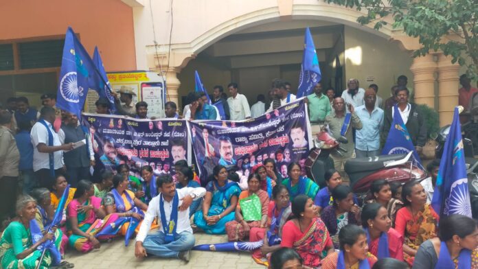 ಚಿಕ್ಕಬಳ್ಳಾಪುರ ನಗರದ ಬಿ.ಆರ್.ಅಂಬೇಡ್ಕರ್ ವಸತಿ ನಿಲಯದ ಮುಂಭಾಗದಿಂದ ತಾಲೂಕು ಕಚೇರಿ ಆವರಣದವರೆಗೆ ಪ್ರತಿಭಟನಾ ಮೆರವಣಿಗೆ ನಡೆಸಿ, ತಾಲೂಕು ಕಚೇರಿ ಆವರಣದಲ್ಲಿ ಧರಣಿ ಕುಳಿತ ಕಾರ್ಯಕರ್ತರು ತಾಲೂಕು ಆಡಳಿತ, ಗ್ರಾಮ ಪಂಚಾಯಿತಿ ಅಧಿಕಾರಿಗಳು, ಸದಸ್ಯರ ವಿರುದ್ಧ ಧಿಕ್ಕಾರ ಕೂಗಿದರು.