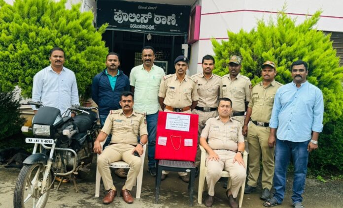 ಹೇಮಂತ್ ಕುಮಾರ್ (27), ಆಲಂ ಖಾನ್ (30) ಬಂಧಿತ ಆರೋಪಿಗಳು. ಚಿಕ್ಕಮಗಳೂರು ನಗರದ ಮೆಸ್ಕಾಂ ಕಛೇರಿ ಎದುರಿನಲ್ಲಿರುವ ಮನೆಯಲ್ಲಿದ್ದ ಒಂಟಿ ಮಹಿಳೆಯನ್ನು ಹೆದರಿಸಿ ಬಲವಂತವಾಗಿ ಅವರ ಕುತ್ತಿಗೆಯಲ್ಲಿದ್ದ, 45 ಗ್ರಾಂ ಬೆಲೆ ಬಾಳುವ ಚಿನ್ನದ ಮಾಂಗಲ್ಯ ಸರವನ್ನು ಕಿತ್ತುಕೊಂಡು ಹೋಗಿದ್ದ, ಈ ಪ್ರಕರಣ ಕುರಿತು ಪೊಲೀಸ್ ತಂಡವು 24 ಗಂಟೆಯೊಳಗಾಗಿ ಇಬ್ಬರು ಆರೋಪಿಗಳನ್ನು ಬಂಧಿಸಿ ರೂ. 3.40 ಲಕ್ಷ ಮೌಲ್ಯದ 45 ಗ್ರಾಂ ತೂಕದ ಚಿನ್ನದ ಮಾಂಗಲ್ಯ ಸರವನ್ನು ವಶಪಡಿಸಿಕೊಂಡಿದ್ದಾರೆ.