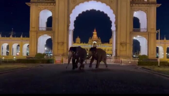 ಅರಮನೆಯ ಜಯಮಾರ್ತಾಂಡ‌ ದ್ವಾರದ‌ ಮೂಲಕ ಹೊರಗಡೆ ಬಂದ ಆನೆಗಳು, ರಸ್ತೆಯ ಕಡೆಗೆ ಓಡಿತು.