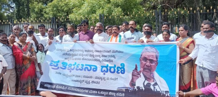 ಬೀದರ ನಗರದ ಡಾ.ಬಿ.ಆರ್. ಅಂಬೇಡ್ಕರ ವೃತ್ತದ ಎದುರುಗಡೆ ಜಿಲ್ಲಾ ಶೋಷಿತ ಸಮುದಾಯಗಳ ಮಹಾ ಒಕ್ಕೂಟದ ಪದಾಧಿಕಾರಿಗಳು ಬಿಜೆಪಿ ಹಾಗೂ ಜೆಡಿಎಸ್ನ ಒಳಸಂಚನ್ನು ಖಂಡಿಸಿ ಕೆಲಕಾಲ ಪ್ರತಿಭಟಿಸಿ ಸಿಎಂ ಸಿದ್ದರಾಮಯ್ಯನವರ ಪರ ಘೋಷಣೆ ಕೂಗಿದರು.