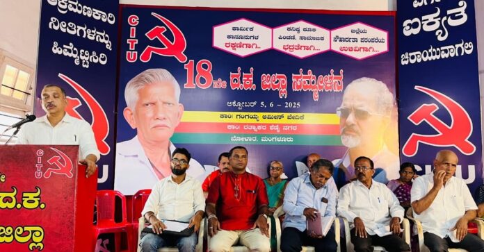 CITU 18ನೇ ದಕ್ಷಿಣ ಕನ್ನಡ ಜಿಲ್ಲಾ ಸಮ್ಮೇಳನವನ್ನು ಉದ್ಘಾಟಿಸಿ ಮಾತನಾಡಿದ ಅವರು, “ಕೇಂದ್ರ ಹಾಗೂ ರಾಜ್ಯ ಸರಕಾರಗಳು ನಿರಂತರವಾಗಿ ಕಾರ್ಮಿಕ ವಿರೋಧಿ ನೀತಿಗಳನ್ನು ಜಾರಿಗೊಳಿಸುವ ಮೂಲಕ ಕಾರ್ಪೊರೇಟ್ ಕಂಪೆನಿಗಳ ಹಿತಾಸಕ್ತಿಗಳನ್ನು ಕಾಪಾಡುತ್ತಿದೆಯೇ ಹೊರತು ದುಡಿಯುವ ವರ್ಗದ ಪರವಾಗಿ ಯಾವುದೇ ನೀತಿಗಳನ್ನು ಜಾರಿಗೊಳಿಸುತ್ತಿಲ್ಲ. ಇಂತಹ ಸರಕಾರಗಳ ಆಕ್ರಮಣಕಾರಿ ನೀತಿಗಳನ್ನು ಕಾರ್ಮಿಕ ವರ್ಗ ಸಮರಶೀಲ ಹೋರಾಟಗಳ ಮೂಲಕವೇ ಹಿಮ್ಮೆಟ್ಟಿಸಲು ಸಾಧ್ಯ” ಎಂದು ಹೇಳಿದರು.