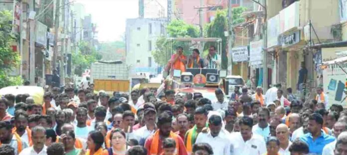 ಸಾವಿರಾರು ಕಾರ್ಯಕರ್ತರೊಂದಿಗೆ ಶಿವಮೊಗ್ಗ ಹರಪನಹಳ್ಳಿ ವೃತ್ತ ಮಾರ್ಗವಾಗಿ ರಸ್ತೆಯಿಂದ ಹರಿಹರೇಶ್ವರ ದೇವಸ್ಥಾನದವರೆಗೂ ಮೆರವಣಿಗೆ ಮಾಡಲಾಯಿತು.