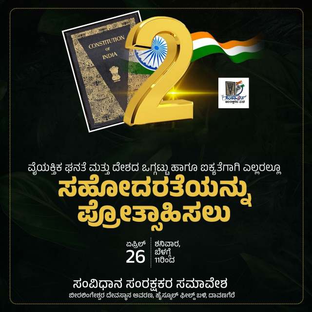 ದಾವಣಗೆರೆಯಲ್ಲಿ ಏಪ್ರಿಲ್ 26ರಂದು ಹೈಸ್ಕೂಲ್ ಆವರಣದ ಬಳಿಯ ಬೀರಲಿಂಗೇಶ್ವರ ಮೈದಾನದಲ್ಲಿ ಸಂವಿಧಾನ ಸಂರಕ್ಷಕರ ಸಮಾವೇಶ ಹಮ್ಮಿಕೊಳ್ಳಲಾಗಿದೆ. ಸಂವಿಧಾನ ಸಂರಕ್ಷಣಾ ಪಡೆ ಕಟ್ಟುವ ಮಹಾಯಾನದ ಚಾಲನೆಗಾಗಿ ಸಂವಿಧಾನ ಸಂರಕ್ಷಕರ ಸಮಾವೇಶ ಆಯೋಜಿಸಿದ್ದು, ರಾಜ್ಯದ ಮೂಲೆ ಮೂಲೆಗಳಿಂದ ಸಂವಿಧಾನ ಸಂರಕ್ಷಕರ ಸಮಾವೇಶಕ್ಕೆ ಸಾಕ್ಷಿಯಾಗಲು, ಕಾರ್ಯಪಡೆಯಲ್ಲಿ ಪಾಲುದಾರರಾಗಲು ಜನ ಸಮೂಹ ಆಗಮಿಸುತ್ತಿದೆ.