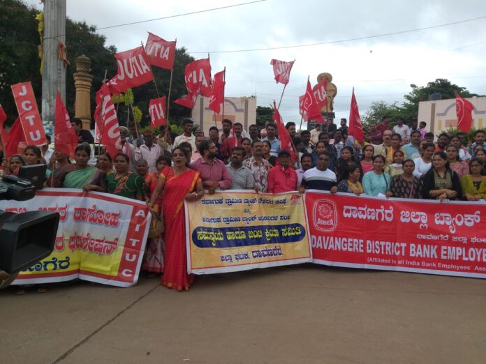 ಸರ್ಕಾರಗಳ ರೈತ, ಕಾರ್ಮಿಕ, ಜನವಿರೋಧಿ ನೀತಿಗಳ ವಿರುದ್ಧ ಜುಲೈ 9ರಂದು ರಾಷ್ಟ್ರವ್ಯಾಪಿ ಮುಷ್ಕರಕ್ಕೆ ಕರೆ ನೀಡಿದ ಹಿನ್ನೆಲೆಯಲ್ಲಿ ದಾವಣಗೆರೆಯಲ್ಲಿ ಸಂಯುಕ್ತ ಹೋರಾಟ ಕರ್ನಾಟಕ ಅಡಿಯಲ್ಲಿ ರೈತ ಸಂಘಟನೆಗಳು, ಕಾರ್ಮಿಕ ಸಂಘಟನೆಗಳು ಹಾಗೂ ಪ್ರಗತಿಪರ, ಜನಪರ ಸಂಘಟನೆಗಳು ಒಗ್ಗೂಡಿ ಪ್ರತಿಭಟನಾ ಮೆರವಣಿಗೆ ನೆಡೆಸುವ ಮೂಲಕ ಮುಷ್ಕರ ನಡೆಸಿದರು.