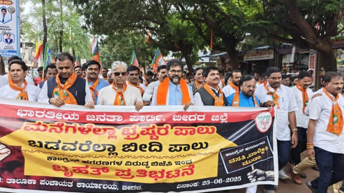 ರಾಜೀವ್ ಗಾಂಧಿ ವಸತಿ ನಿಗಮದ ಯೋಜನೆಗಳಲ್ಲಿ ನಡೆಯುತ್ತಿರುವ ಭ್ರಷ್ಟಾಚಾರವನ್ನು ಖಂಡಿಸಿ ಬೀದರ್ ನಗರದಲ್ಲಿ ಭಾರತೀಯ ಜನತಾ ಪಕ್ಷದ ನಾಯಕರು ಪ್ರತಿಭಟನೆ ನಡೆಸಿದರು.