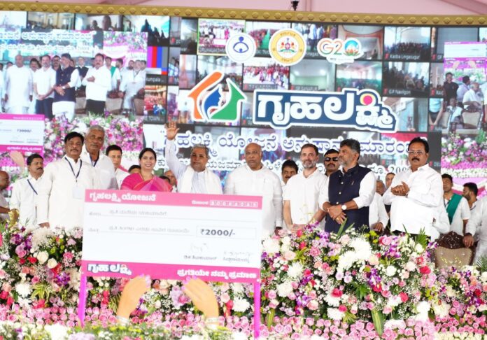 ಮೈಸೂರಿನ ಮಹಾರಾಜ ಕಾಲೇಜು ಆವರಣದಲ್ಲಿ ನಡೆದ ಗೃಹಲಕ್ಷ್ಮಿ ಯೋಜನೆಯ 2000 ರೂ. ಸಹಾಯಧನ ವಿತರಣೆ ಕಾರ್ಯಕ್ರಮಕ್ಕೆ ಎಐಸಿಸಿ ಅಧ್ಯಕ್ಷ ಮಲ್ಲಿಕಾರ್ಜುನ ಖರ್ಗೆ, ಕಾಂಗ್ರೆಸ್ ನಾಯಕ ರಾಹುಲ್ ಗಾಂಧಿ, ಮುಖ್ಯಮಂತ್ರಿ ಸಿದ್ದರಾಮಯ್ಯ, ಉಪಮುಖ್ಯಮಂತ್ರಿ ಡಿಕೆ ಶಿವಕುಮಾರ್ ಹಾಗೂ ಸಚಿವೆ ಲಕ್ಷ್ಮಿ ಹೆಬ್ಬಾಳ್ಕರ್ ಸೇರಿದಂತೆ ಹಲವು ನಾಯಕರು ದೀಪ ಬೆಳಗಿಸುವ ಮೂಲಕ ಚಾಲನೆ ನೀಡಿದರು.