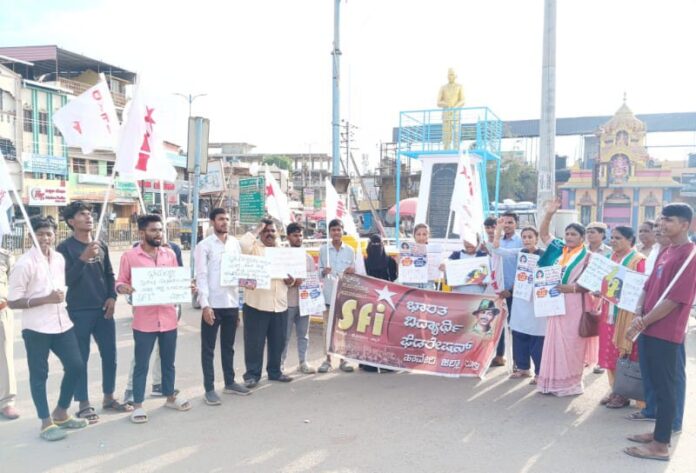 ಹಾವೇರಿ ಪಟ್ಟಣದ ಹೊಸಮನಿ ಸಿದ್ದಪ್ಪ ವೃತ್ತದಲ್ಲಿ ಭಾರತ ವಿದ್ಯಾರ್ಥಿ ಫೆಡರೇಷನ್, ಭಾರತ ಪ್ರಜಾಸತ್ತಾತ್ಮಕ ಯುವಜನ ಫೆಡರೇಷನ್ ಹಾಗೂ ಸಮಾನ ಮನಸ್ಕ ಪ್ರಗತಿಪರ ಸಂಘಟನೆಗಳ ನೇತೃತ್ವದಲ್ಲಿ ವಿದ್ಯಾರ್ಥಿನಿ ಮೇಲೆ ಲೈಂಗಿಕ ಕಿರುಕುಳ ನೀಡಿದ ಶಿಕ್ಷಕನ ಮೇಲೆ ಕ್ರಮ ಜರುಗಿಸುವಂತೆ ಪ್ರತಿಭಟನೆ ನಡೆಸಿದರು.