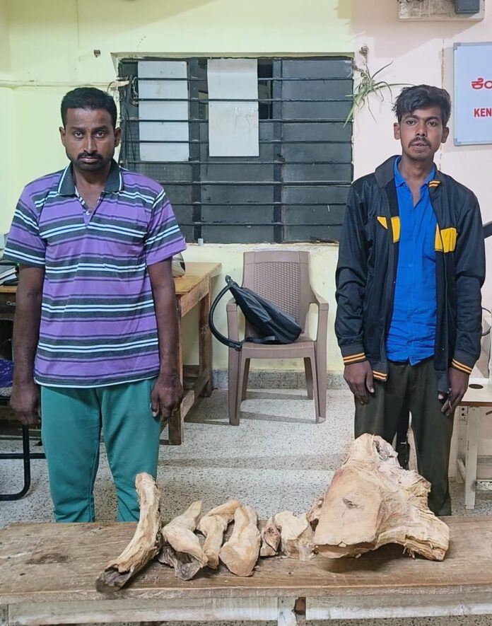 ಶ್ರೀಗಂಧ ಮರದ ತುಂಡುಗಳನ್ನು ಅಕ್ರಮವಾಗಿ ದಾಸ್ತಾನು ಮಾಡಿಟ್ಟಿದ್ದ ಇಬ್ಬರು ಆಸಾಮಿಗಳನ್ನು ಚಿಕ್ಕಬಳ್ಳಾಪುರ ಜಿಲ್ಲೆ ಚಿಂತಾಮಣಿ ತಾಲೂಕಿನ ಕೆಂಚಾರ್ಲಹಳ್ಳಿ ಠಾಣೆ ಪೊಲೀಸರು ಶನಿವಾರ ಬಂಧಿಸಿದ್ದಾರೆ.