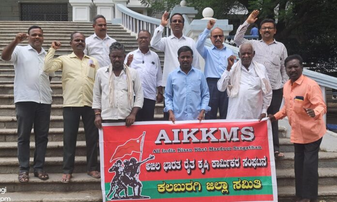 ನಗರದಲ್ಲಿ ಸೋಮವಾರ ಜಿಲ್ಲಾಧಿಕಾರಿ ಕಚೇರಿ ಎದುರುಗಡೆ ಅಖಿಲ ಭಾರತ ಕಿಸಾನ್ ಖೇತ್ ಮಜ್ದೂರ್ ಸಂಘ ಜಿಲ್ಲಾ ಸಮಿತಿ ಕಲಬುರಗಿ ವತಿಯಿಂದ ಪ್ರತಿಭಟನೆ ನಡೆಸಿ ಕಲಬುರಗಿ ಜಿಲ್ಲಾಧಿಕಾರಿಗಳ ಮುಖಾಂತರ ಮುಖ್ಯಮಂತ್ರಿ ಸಿದ್ದರಾಮಯ್ಯನವರಿಗೆ ಮನವಿ ಸಲ್ಲಿಸಿದರು.