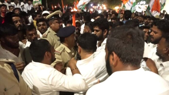 ಮತಗಳ್ಳತನ ವಿರೋಧಿಸಿ ಕೇಂದ್ರ ಸರ್ಕಾರದ ವಿರುದ್ಧ ಕೋಲಾರ ನಗರದಲ್ಲಿ ಯೂತ್ ಕಾಂಗ್ರೆಸ್ ಹಮ್ಮಿಕೊಂಡಿದ್ದ ಪಂಜಿನ ಮೆರವಣಿಗೆಯಲ್ಲಿ ಬಣಗಳ ಜಗಳ ನಡೆದಿದ್ದು, ರಾಜ್ಯ ಯೂತ್ ಕಾಂಗ್ರೆಸ್ ಪ್ರಧಾನ ಕಾರ್ಯದರ್ಶಿ ಸುನಿಲ್ ನಂಜೇಗೌಡ ಹಾಗೂ ಜಿಲ್ಲಾ ಯೂತ್ ಕಾಂಗ್ರೆಸ್ ಅಧ್ಯಕ್ಷ ಸೈಯದ್ ಅಫ್ರಿದ್ ಬಣಗಳ ನಡುವೆ ಮಾತಿನ ಚಕಮಕಿ ನಡೆದು ಪೊಲೀಸರು ಮಧ್ಯ ಪ್ರವೇಶಿಸಬೇಕಾಯಿತು.