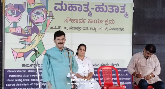 ಅವರು ಇಂದು ಕುಂದಾಪುರದ ಶಾಸ್ತ್ರಿ ಸರ್ಕಲ್ ಬಳಿ ಸಮಾನ ಮನಸ್ಕ ಸಂಘಟನೆಗಳ ನೇತೃತ್ವದಲ್ಲಿ ಗಾಂಧಿ ಹುತಾತ್ಮ ದಿನದಂದು ಆಯೋಜಿಸಲಾದ “ಮಹಾತ್ಮ ಹುತಾತ್ಮ” ಕಾರ್ಯಕ್ರಮದಲ್ಲಿ ಮಾತನಾಡಿದರು. ಸತ್ಯಕ್ಕೆ ವಿವೇಕದ ಶಕ್ತಿ ಇದೆ; ಅದಕ್ಕೆ ಅಳಿವು ಇಲ್ಲ ಎಂದ ಅವರು, ಗಾಂಧೀಜಿ ಸನಾತನವಾದಿ ಹಿಂದೂ ಆಗಿದ್ದರೂ ಎಲ್ಲಾ ಧರ್ಮಗಳನ್ನು ಗೌರವಿಸುವ ತಾತ್ವಿಕತೆಯನ್ನು ಹೊಂದಿದ್ದರು. ‘ನನ್ನ ಧರ್ಮವೇ ಶ್ರೇಷ್ಠ’ ಎನ್ನುವ ಮನೋಭಾವ ಗಾಂಧೀ ತತ್ತ್ವಕ್ಕೆ ವಿರುದ್ಧವಾಗಿದೆ ಎಂದು ಹೇಳಿದರು.