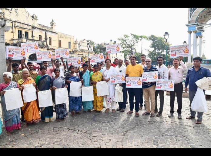 ಮೈಸೂರು ನಗರದ ದೇವರಾಜ ಮಾರ್ಕೆಟ್ ನಲ್ಲಿ ಶುಕ್ರವಾರ ವಿಶ್ವ ಪರಿಸರ ದಿನಾಚರಣೆ ಅಂಗವಾಗಿ ಮೈಸೂರು ಮಹಾನಗರ ಪಾಲಿಕೆ, ಕೆ.ಎಂ.ಪಿ.ಕೆ ಚಾರಿಟೇಬಲ್ ಟ್ರಸ್ಟ್ ಹಾಗೂ ಜೀವದಾರ ರಕ್ತ ನಿಧಿ ಕೇಂದ್ರದ ವತಿಯಿಂದ ‘ ಪ್ಲಾಸ್ಟಿಕ್ ಬ್ಯಾಗ್ ಬಿಡಿ, ಬಟ್ಟೆ ಬ್ಯಾಗ್ ಹಿಡಿ ‘ ಎಂಬ ಜಾಗೃತಿ ಅಭಿಯಾನದ ಮೂಲಕ ಗ್ರಾಹಕರಿಗೆ ಹಾಗೂ ವ್ಯಾಪಾರಸ್ಥರಿಗೆ ಉಚಿತ ಬಟ್ಟೆ ಬ್ಯಾಗ್ ವಿತರಿಸಿ ಪ್ಲಾಸ್ಟಿಕ್ ನಿಂದ ಆಗುವ ಅನಾಹುತಗಳ ಬಗ್ಗೆ ಅರಿವು ಮೂಡಿಸಲಾಯಿತು.