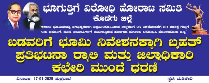 ಕೊಡಗು ಜಿಲ್ಲೆಯ ಮಡಿಕೇರಿಯಲ್ಲಿ ʼಬಡವರಿಗೆ ಭೂಮಿ, ನಿವೇಶನʼ ನೀಡುವಂತೆ ಆಗ್ರಹಿಸಿ ಭೂ ಗುತ್ತಿಗೆ ಹೋರಾಟ ಸಮಿತಿಯಿಂದ ಜನವರಿ 17ರಂದು ಬೃಹತ್ ಪ್ರತಿಭಟನಾ ರ್ಯಾಲಿ ನಡೆಯಲ್ಲಿದ್ದು, ಬಳಿಕ ಜಿಲ್ಲಾಧಿಕಾರಿ ಕಚೇರಿ ಎದುರು ಧರಣಿ ಆಯೋಜಿಸಲಾಗಿದೆ ಎಂದು ಸಂಘಟನಾಕಾರರು ತಿಳಿಸಿದ್ದಾರೆ.