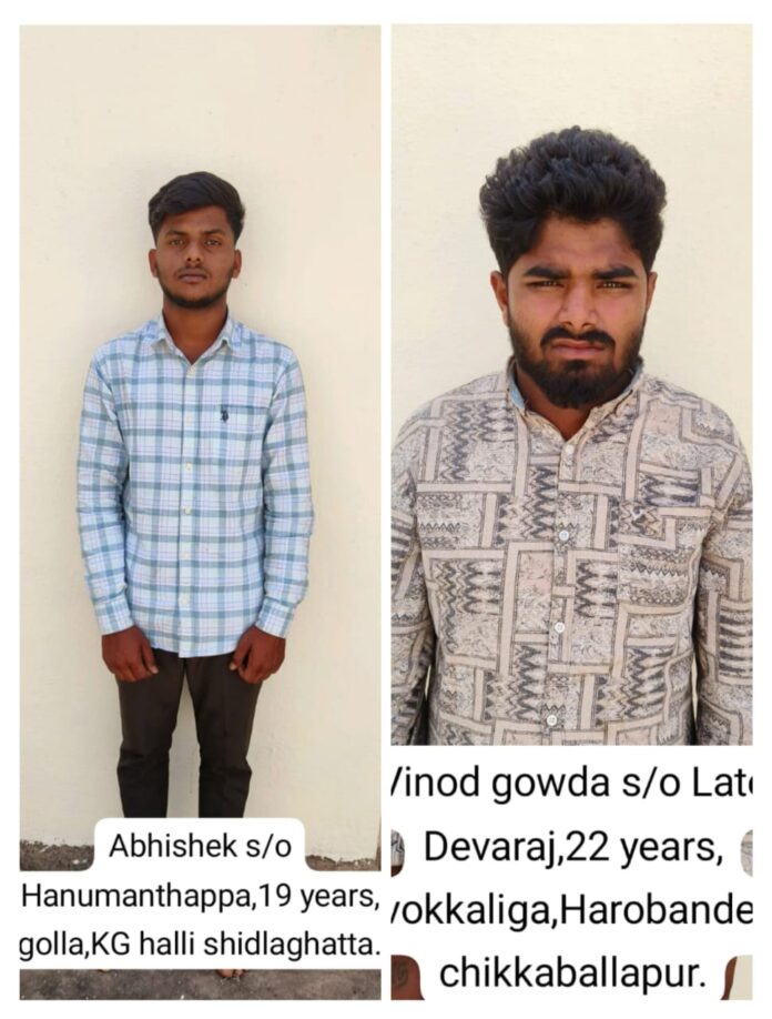 ಹಾರೋಬಂಡೆ ಗ್ರಾಮದ ವಿನೋದ್ ಗೌಡ(22) ಬಿನ್ ಲೇಟ್ ದೇವರಾಜು, ಶಿಡ್ಲಘಟ್ಟ ತಾಲೂಕಿನ ಕೆ.ಜಿ.ಪುರ ಗ್ರಾಮದ ಅಭಿಷೇಕ್ ಬಿನ್ ಹನುಮಂತಪ್ಪ(19) ಕೊಲೆ ಮಾಡಿರುವ ಆರೋಪಿಗಳು.