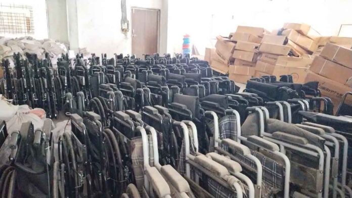 ಚುನಾವಣೆ ಸಂದರ್ಭದಲ್ಲಿ ಅಂಗವಿಕಲರಿಗೆ, ವೃದ್ಧರಿಗೆ ಅನಾರೋಗ್ಯಕ್ಕೆ ತುತ್ತಾಗಿರುವವರಿಗೆ ವಿತರಿಸಲೆಂದು ತಂದಿದ್ದ ನೂರಾರು ಗಾಲಿ ಕುರ್ಚಿಗಳು ನಗರಸಭೆಯ ಗೋಡೌನ್ನಲ್ಲಿ ತುಕ್ಕು ಹಿಡಿಯುತ್ತಿವೆ.