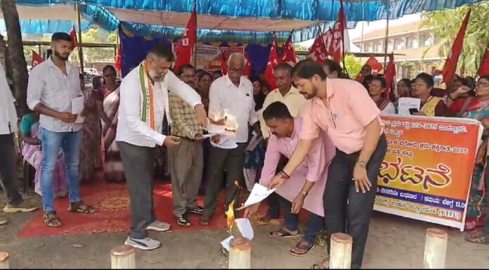 ಸಿಐಟಿಯು ಜಿಲ್ಲಾ ಅಧ್ಯಕ್ಷರಾದ ಶಶಿಧರ ಗೊಲ್ಲ ಹಾಗೂ ಇಂಟಕ್ ಜಿಲ್ಲಾಧ್ಯಕ್ಷ ಕಿರಣ್ ಹೆಗ್ಡೆ ಅವರು ಕರಡು ಪ್ರತಿಯನ್ನು ಸುಡುವುದರ ಮೂಲಕ ಮೋದಿ ಸರಕಾರದ ಕಾರ್ಮಿಕ ವಿರೋಧಿ ನೀತಿಯನ್ನು ಖಂಡಿಸಿದರು.