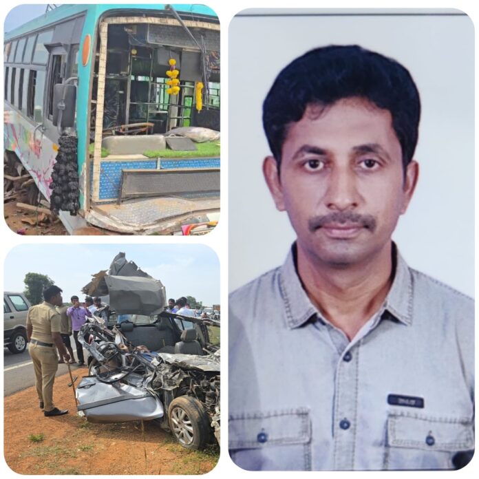 ಭಾನುವಾರ ಬೆಳಿಗ್ಗೆ ಸುಮಾರು 11 ಗಂಟೆ ಸಮಯದಲ್ಲಿ ಕಾರು ಮತ್ತು ಶ್ರೀ ವೆಂಕಟೇಶ್ವರ ಖಾಸಗಿ ಬಸ್ ನಡುವೆ ಭೀಕರ ಅಫಘಾತ ಸಂಭವಿಸಿದ್ದು, ಆಂಧ್ರ ಮೂಲದ ಕಾರು ಚಾಲಕ ಪ್ರವೀಣ್ ಚಂದ್ರ ನಾಯ್ದು(44) ಸ್ಥಳದಲ್ಲೇ ಮೃತಪಟ್ಟಿದ್ದಾನೆ.
