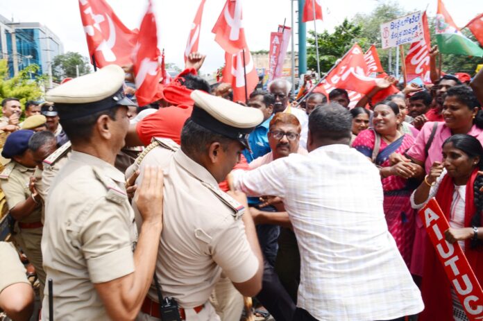 ಕೆಲಸದ ಅವಧಿ ಹೆಚ್ಚಳ, ಕಾನೂನು ಸಂಹಿತೆಗಳನ್ನು ಹಿಂಪಡೆಯುವುದು, ಬೆಲೆ ಹೆಚ್ಚಳಕ್ಕೆ ಅನುಗುಣವಾಗಿ ವೇತನ ಹೆಚ್ಚಳ ಸೇರಿದಂತೆ 21 ಪ್ರಮುಖ ಬೇಡಿಕೆಗಳನ್ನು ಈಡೇರಿಸುವಂತೆ ಆಗ್ರಹಿಸಿ ಸಿಐಟಿಯು ಮತ್ತು ಜೆಸಿಟಿಯು ಸೇರಿದಂತೆ 10 ಕಾರ್ಮಿಕ ಸಂಘಟನೆಗಳ ನೇತೃತ್ವದಲ್ಲಿ ನೂರಾರು ಕಾರ್ಮಿಕರು ಮುಷ್ಕರ ನಡೆಸಿದರು.