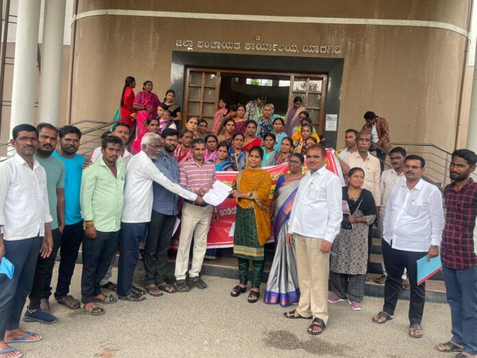 ಸಮಾಜ ಕಲ್ಯಾಣ ಇಲಾಖೆಯ ಹಾಸ್ಟೆಲ್ ಹೊರಗುತ್ತಿಗೆ ನೌಕರರಿಗೆ ಬಾಕಿ ಇರುವ ವೇತನ ಪಾವತಿಸಲು ಒತ್ತಾಯಿಸಿ ಎಐಯುಟಿಯುಸಿ ಸಂಯೋಜಿತ ಕರ್ನಾಟಕ ರಾಜ್ಯ ಸಂಯುಕ್ತ ವಸತಿನಿಲಯ ಕಾರ್ಮಿಕರ ಸಂಘ (ರಿ) ದಿಂದ ಯಾದಗಿರಿ ಜಿಲ್ಲಾ ಪಂಚಾಯತ್ ಕಚೇರಿ ಎದುರು ಪ್ರತಿಭಟನೆ ನಡೆಸಿ ಮನವಿ ಪತ್ರ ಸಲ್ಲಿಸಲಾಯಿತು.